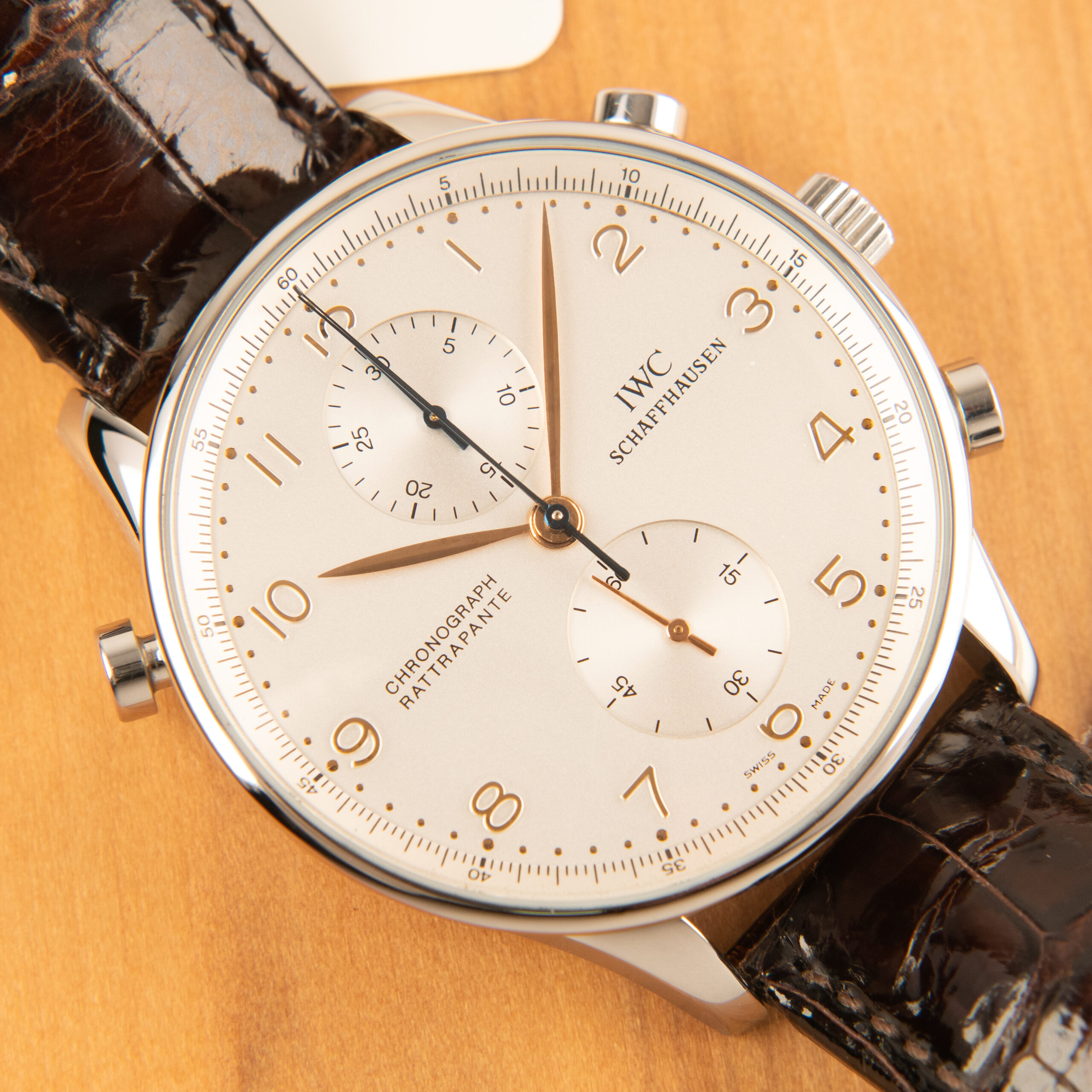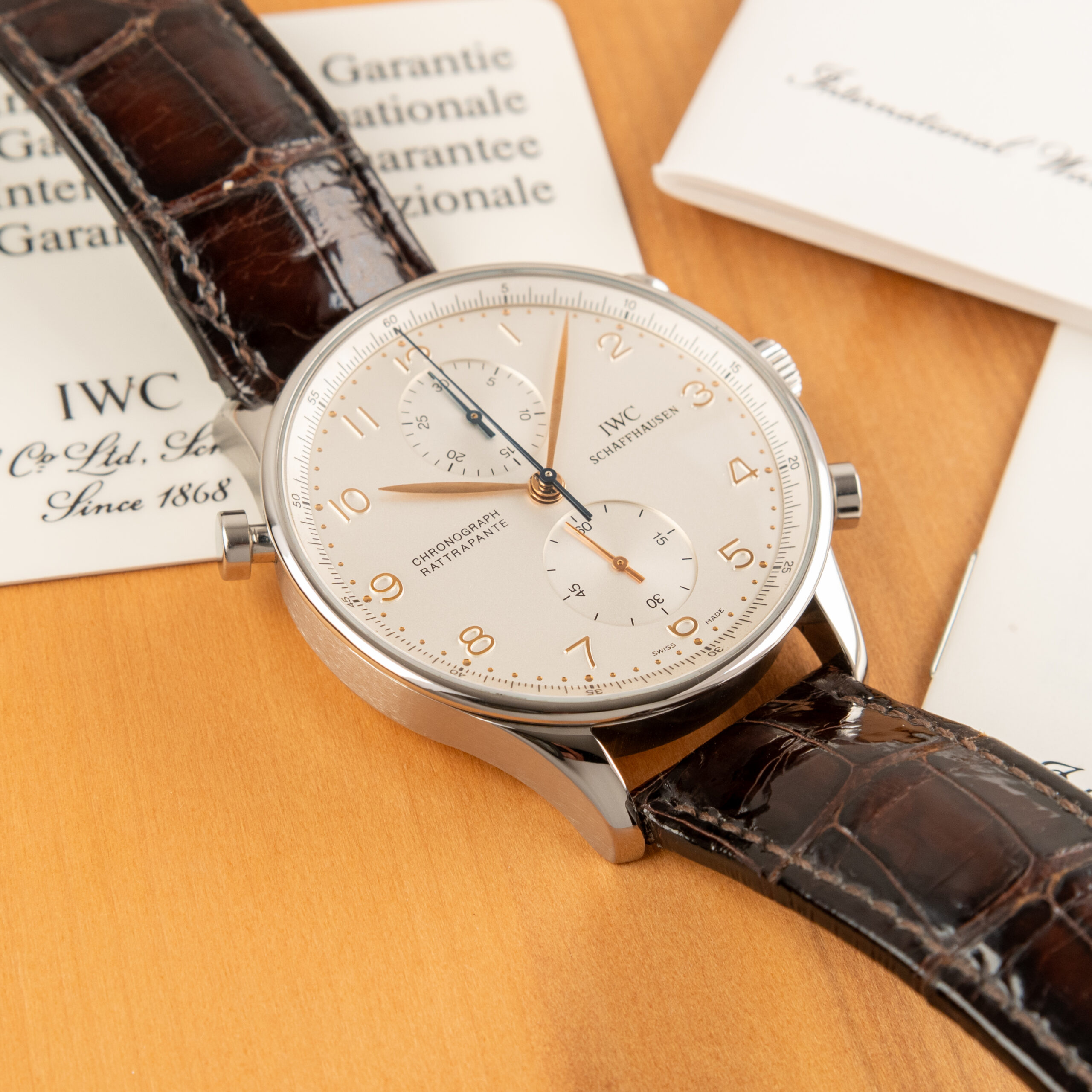 IWC Portugieser Rattrapante ref. IW 3712 con cassa in acciaio da 41 mm, quadrante bianco, cinturino in pelle di coccodrillo e fibbia originali IWC.