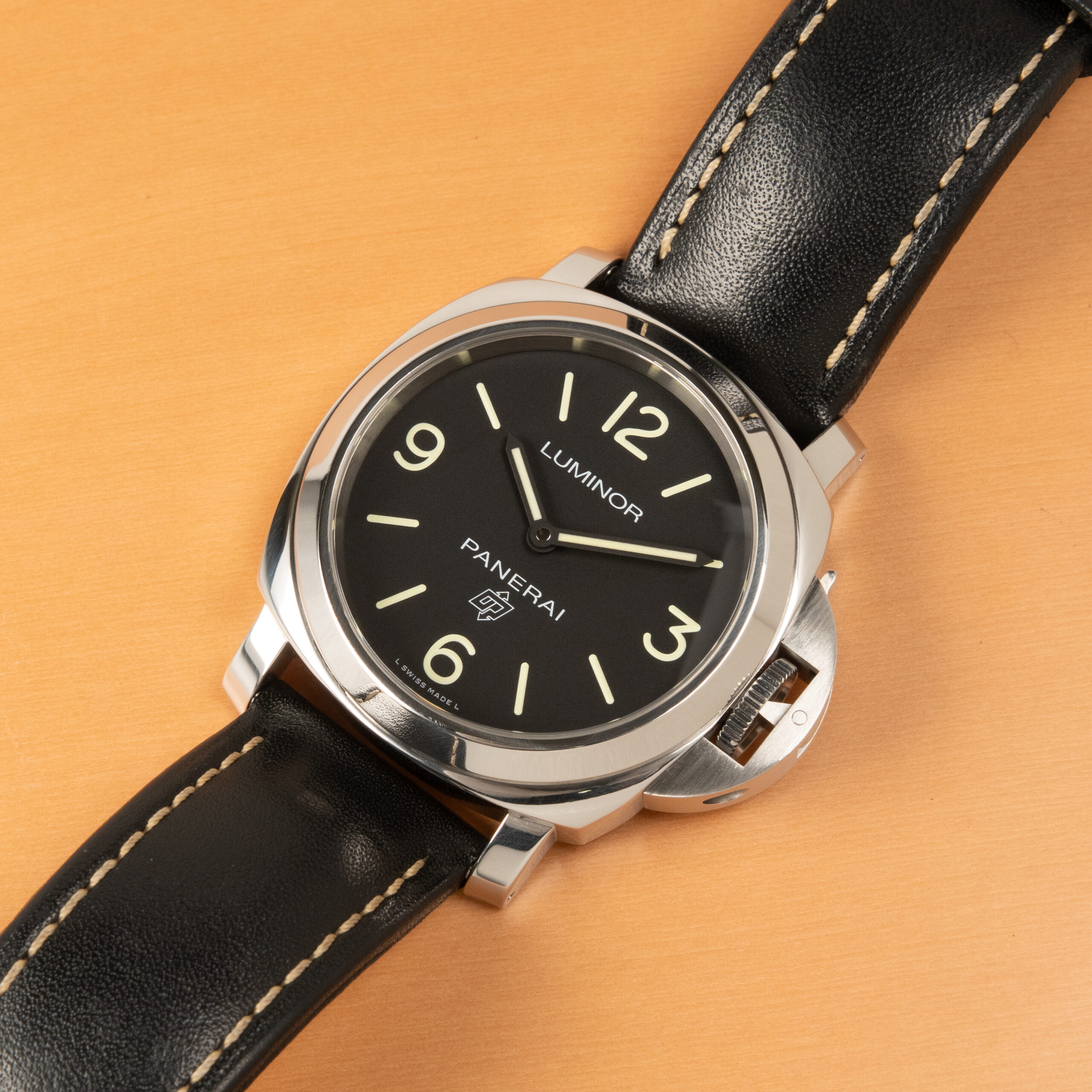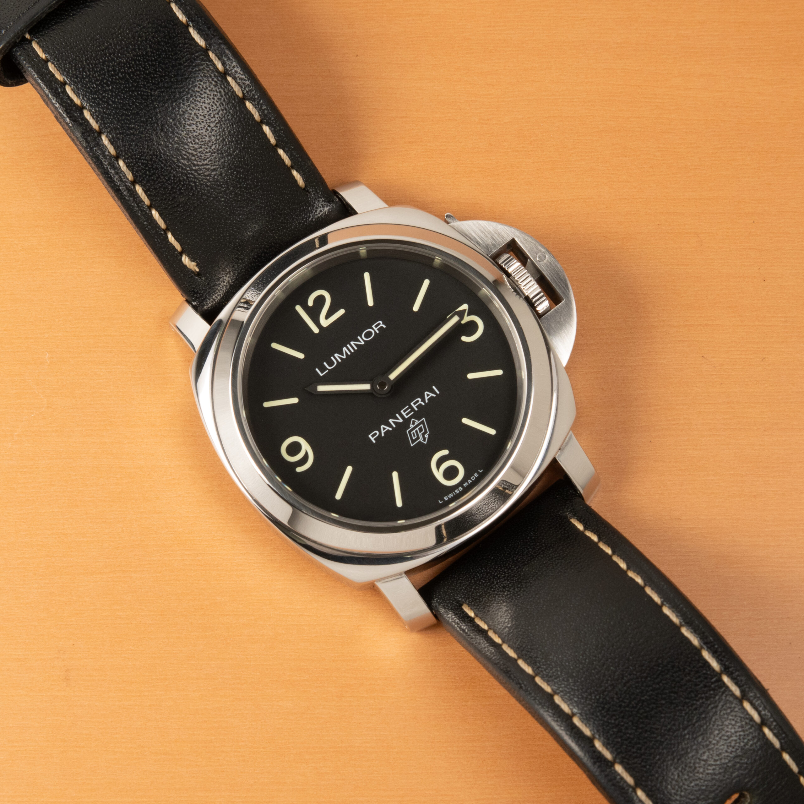 Panerai Luminor Base Logo ref. PAM00773 with a 44 mm stainless steel case and black leather strap.
