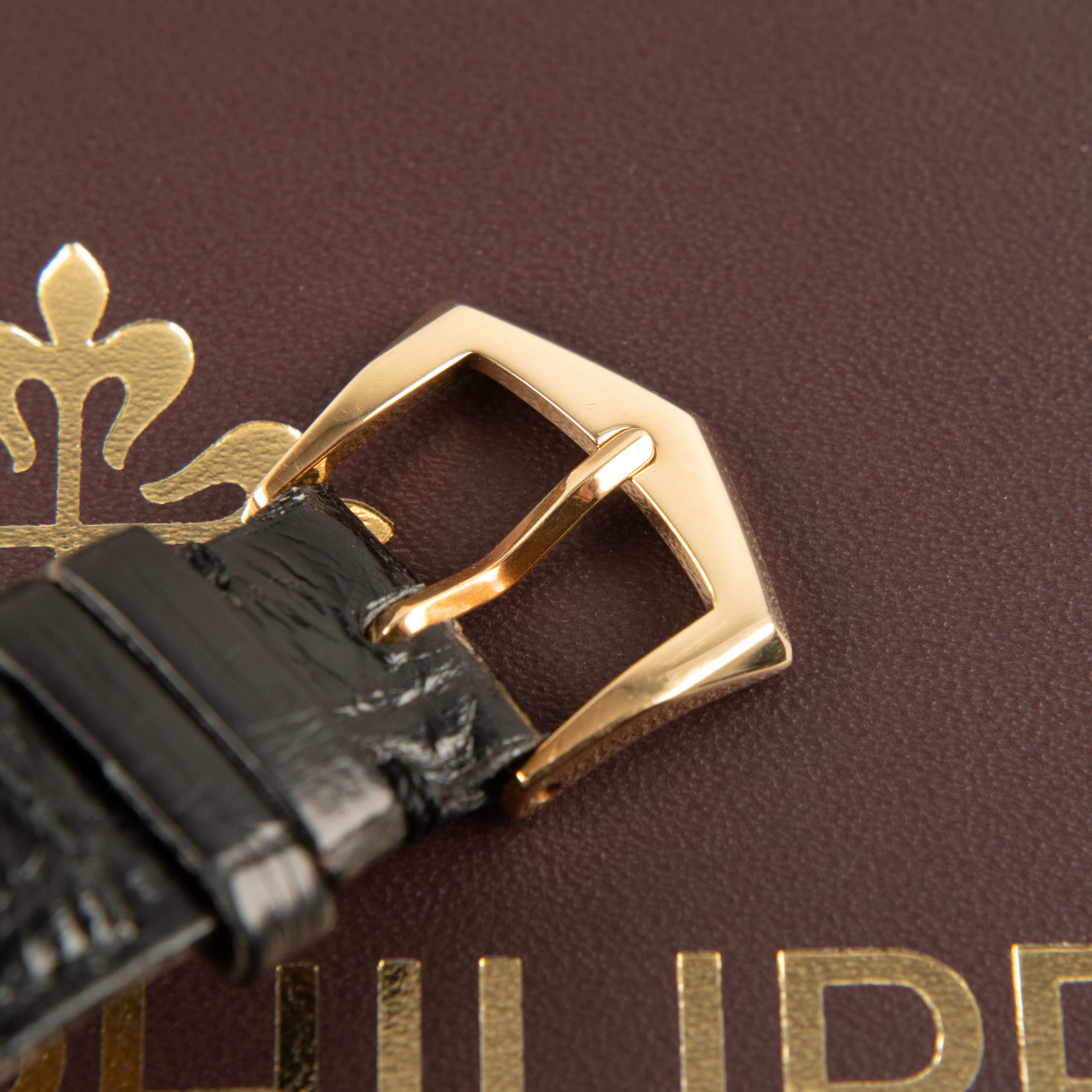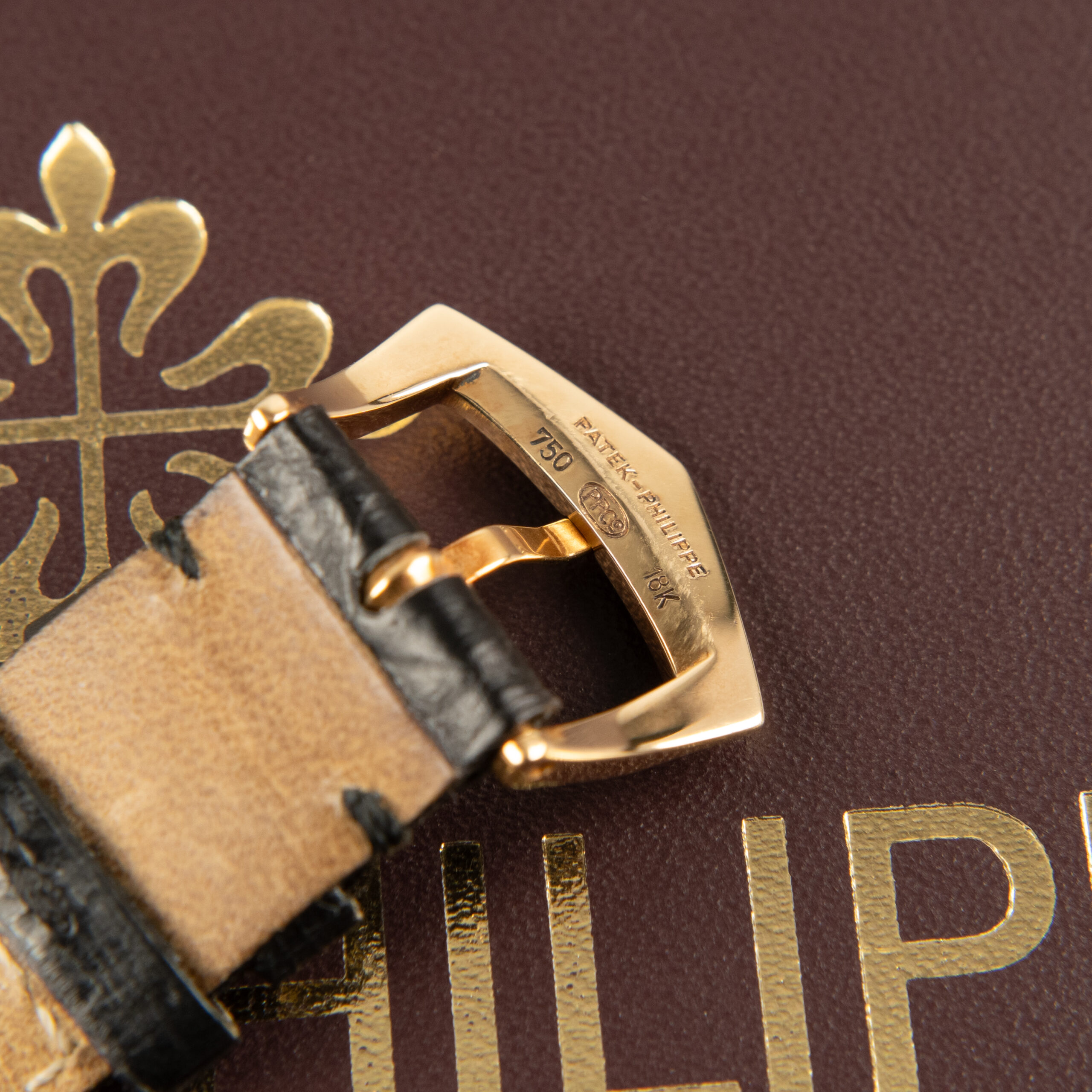 Patek Philippe Calatrava referenza 3998 con cassa in oro giallo da 34 mm, quadrante argentato con indici a bastone in oro. Fibbia originale Patek Philippe in oro.