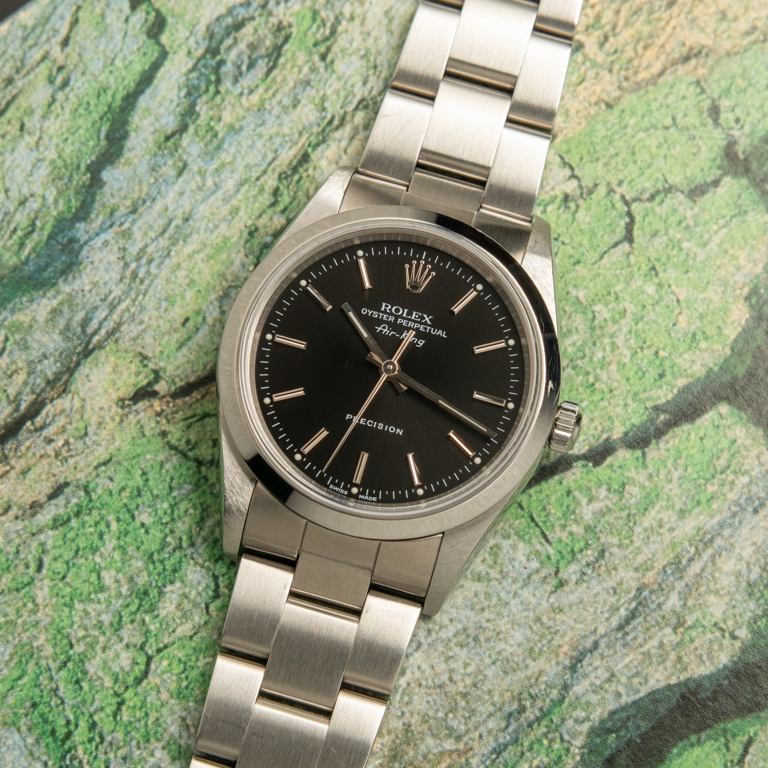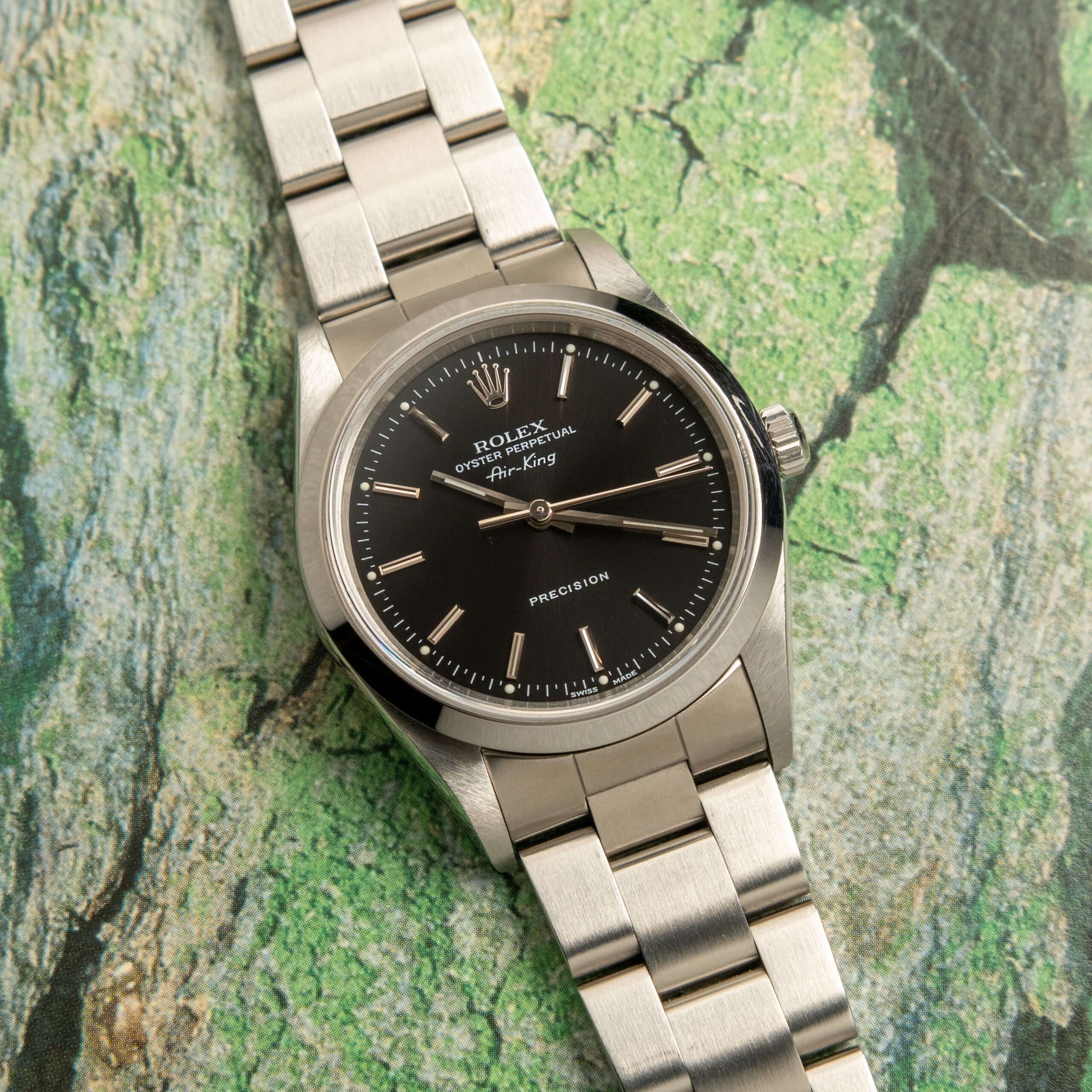 Rolex Air-King referenza 14000 full set del 1999. Cassa da 34 mm con anse senza buchi, quadrante nero, bracciale Oyster. Quadrante in condizioni perfette, la cassa presenta superficiali segni del tempo rimovibili con una leggera lucidatura eseguibile su richiesta.