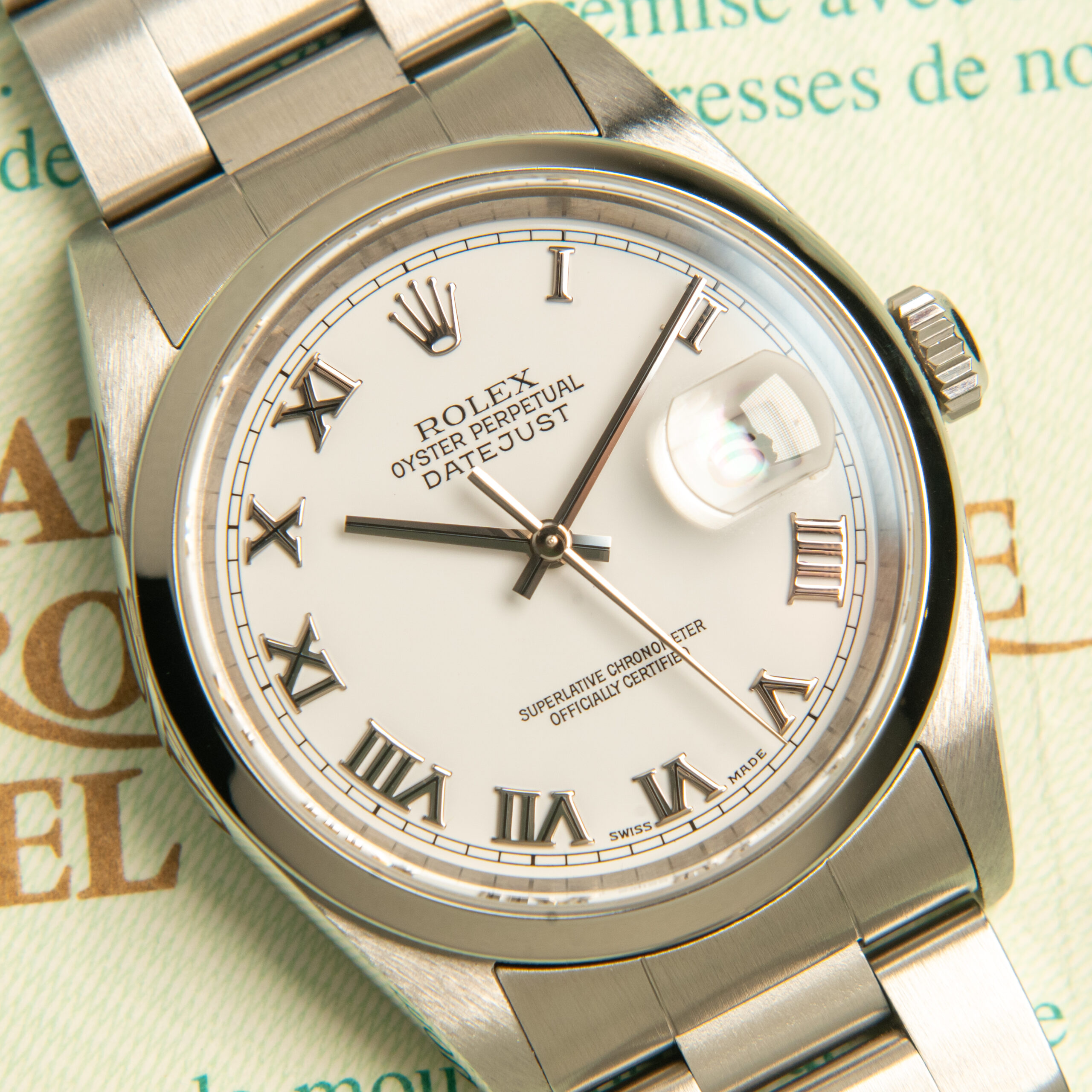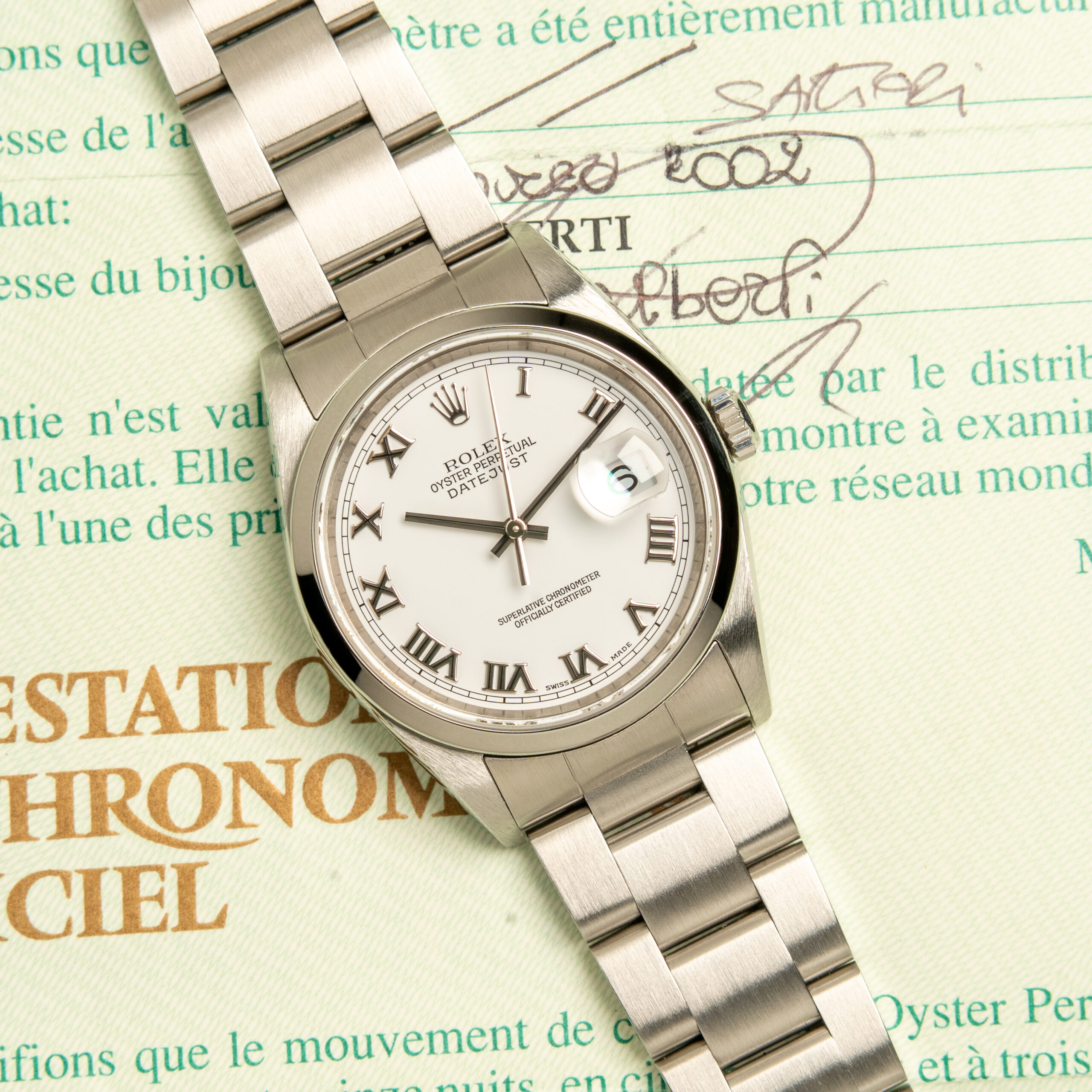 Rolex Datejust referenza 16200 con cassa in acciaio da 36 mm, quadrante bianco con indici romani, lunetta liscia e bracciale Oyster.