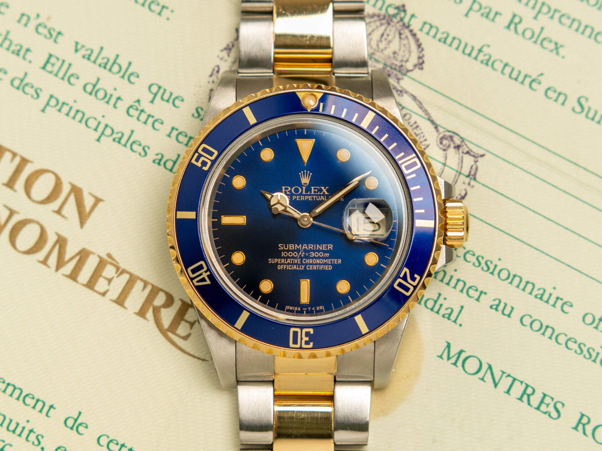 This Rolex GMT-Master II Ref. 16713 from 1996 features a 40 mm stainless steel case. The watch has a "ghost" bezel—a term used to describe the gentle fading of its original colors over time, resulting in a unique patina highly sought after by collectors. The tropical dial adds a further touch of rarity, offering the kind of character only watches from this era can boast.