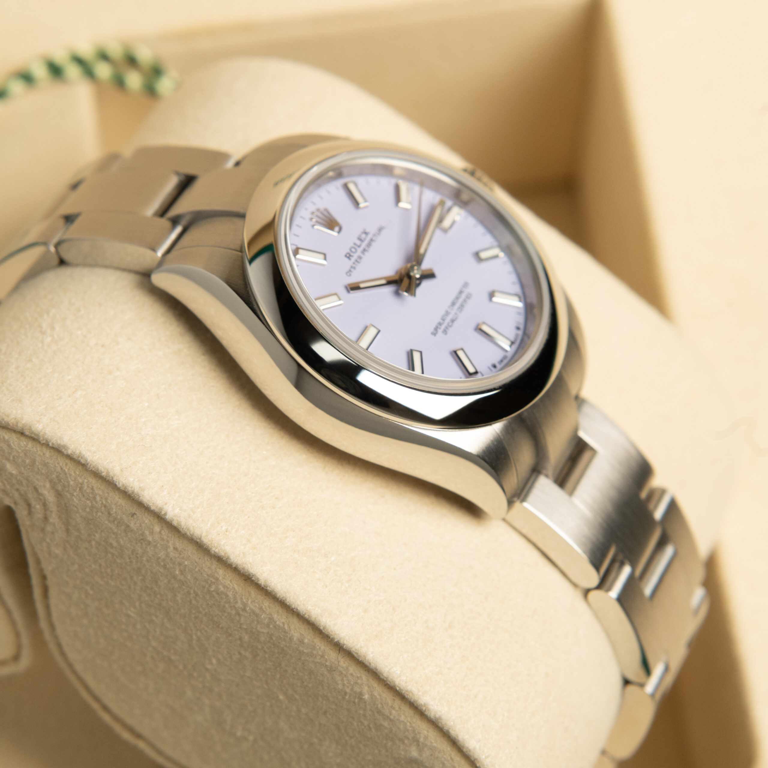 Rolex Oyster Perpetual 28 referenza 276200 con quadrante color lavanda. Cassa da 28 mm, lunetta liscia e bracciale Oyster.