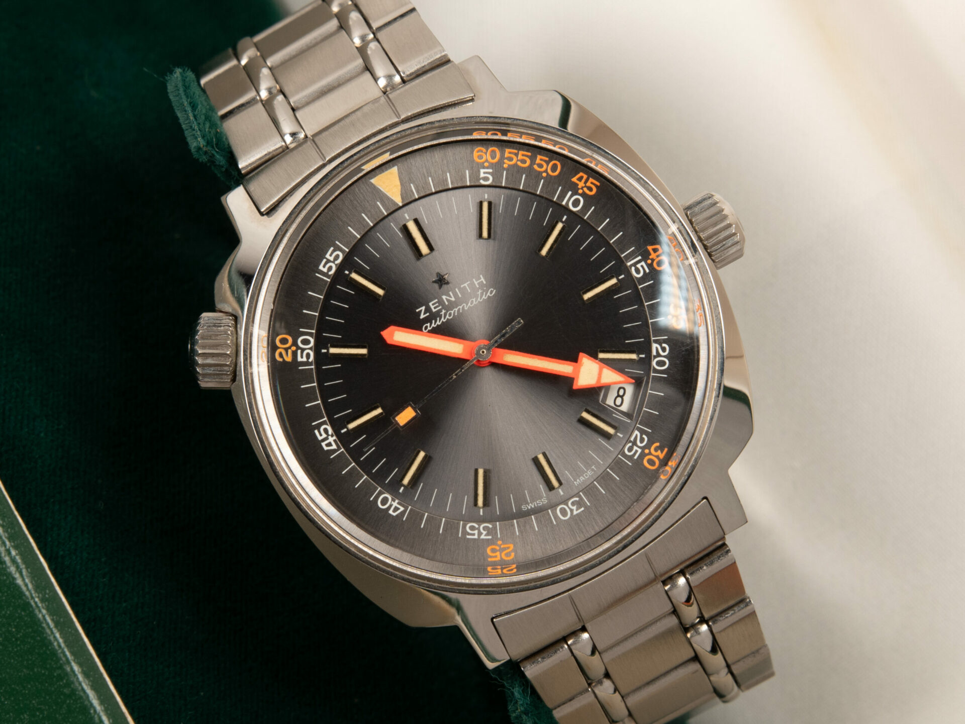 Questo esemplare è in condizioni eccellenti, con quadrante blu perfetto e indici al trizio virati ad una colorazione dorata. Volutamente non lucidato, gli spigoli netti della cassa ne denotano il moderato utilizzo nel tempo.