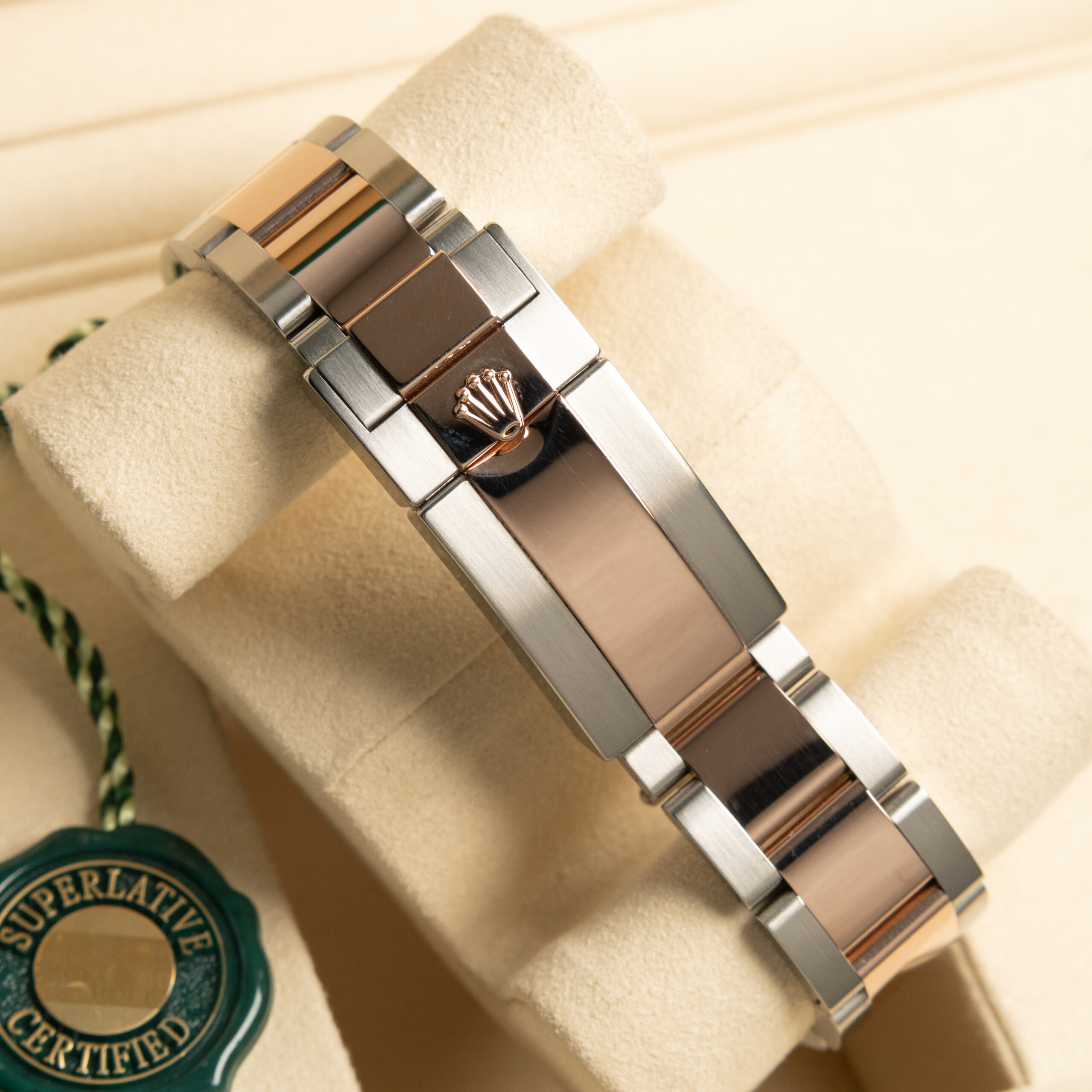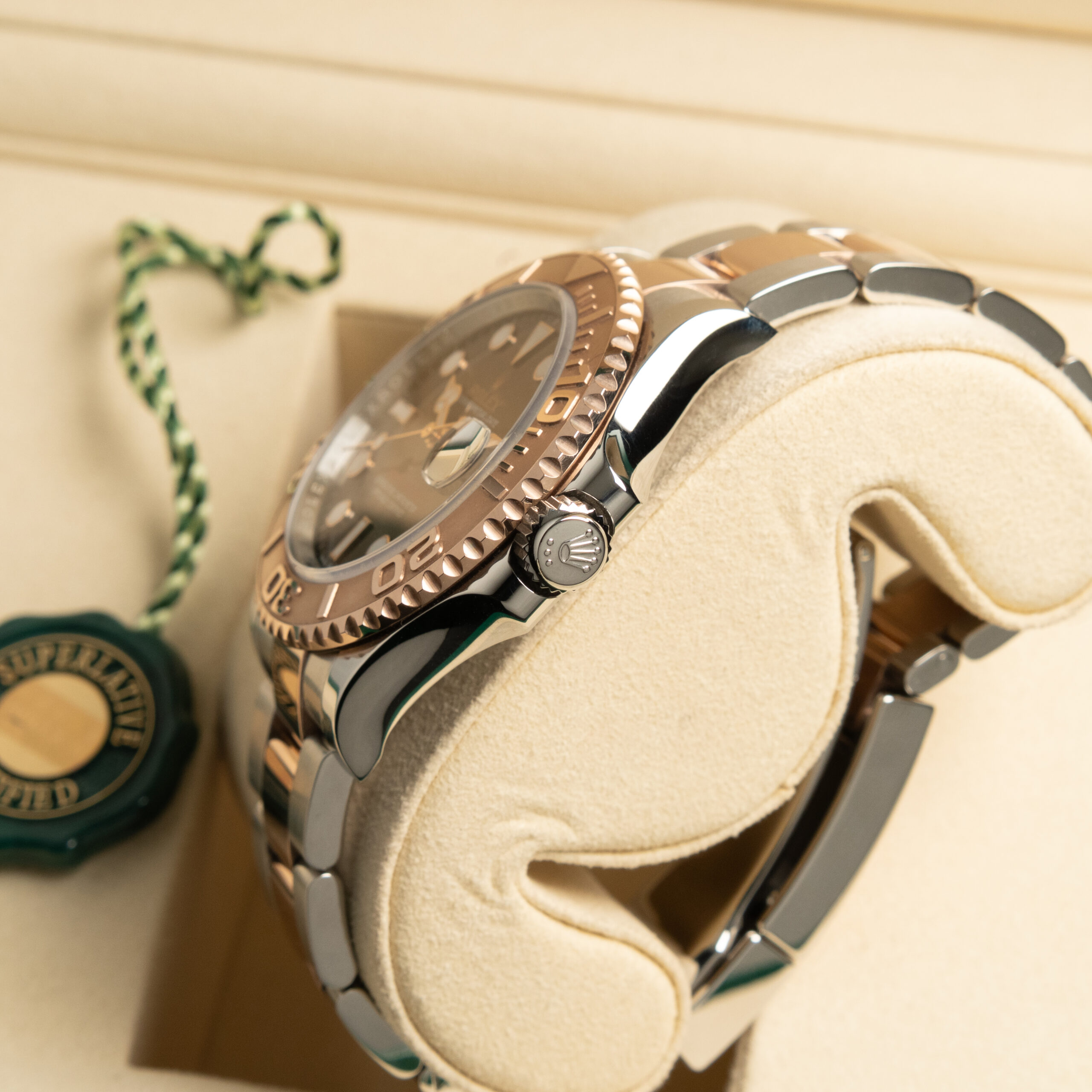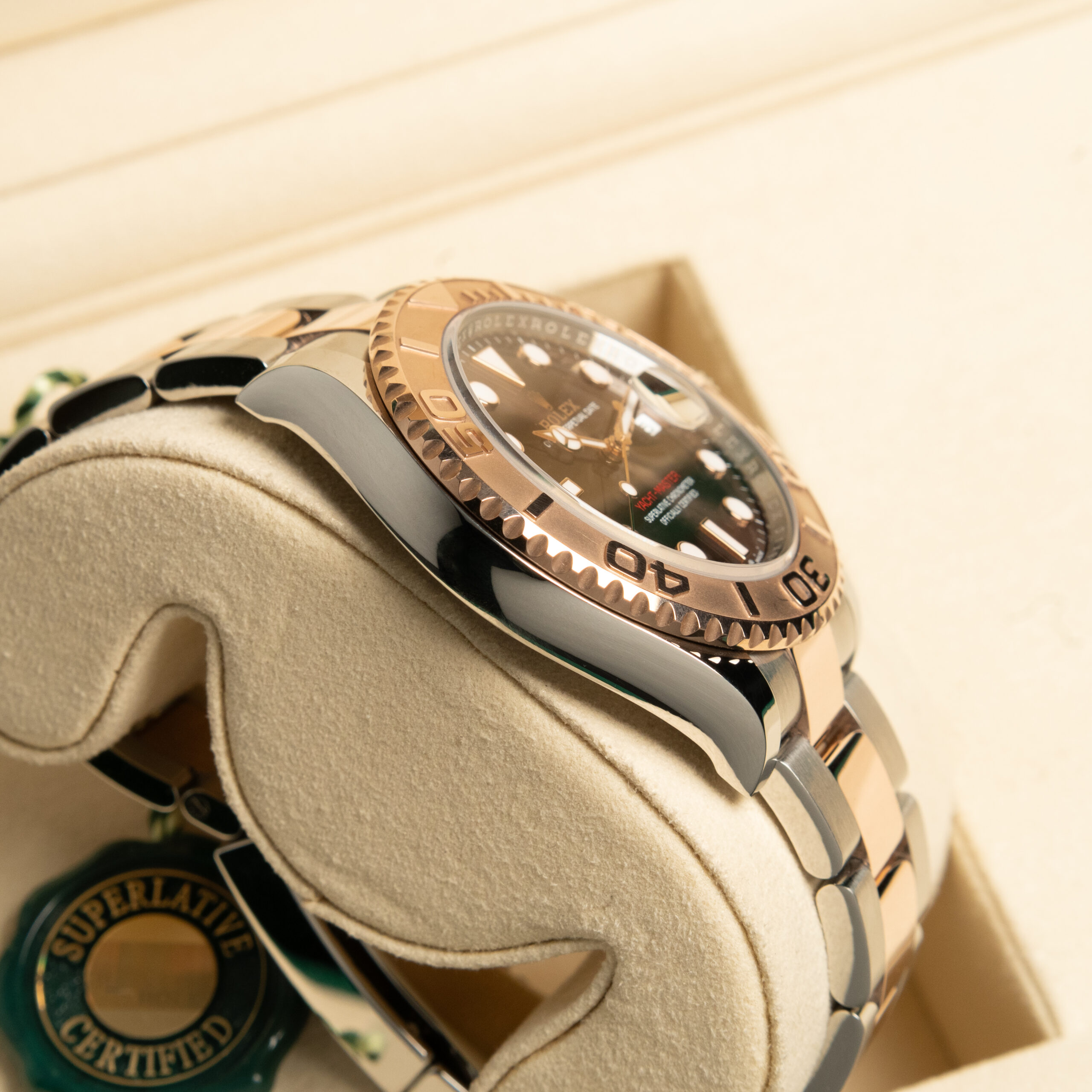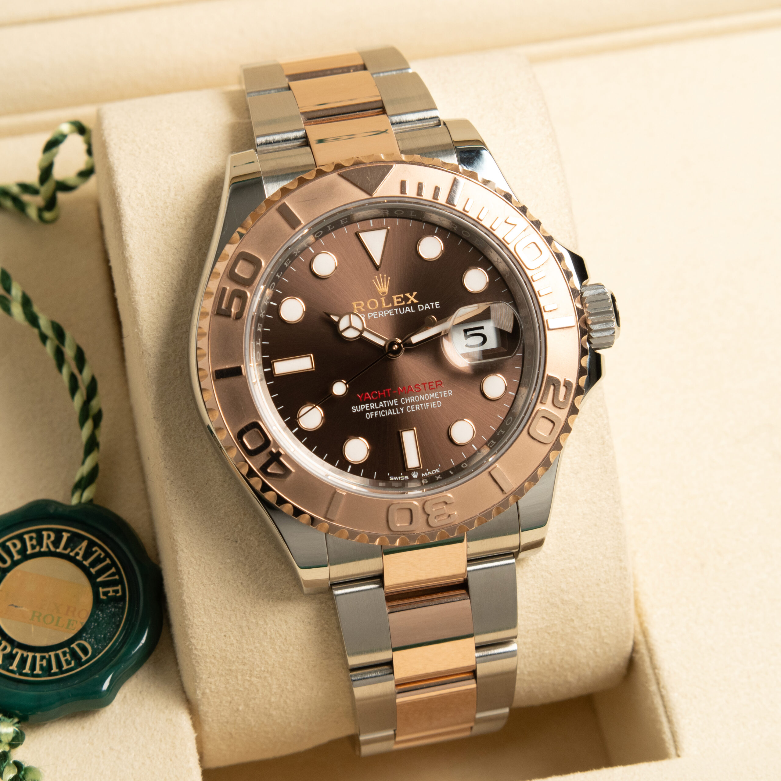 Rolex Yacht-Master 40 reference 126621 in steel and rose gold, full set from June 2025. 40 case in steel, sand-finished bezel in rose gold, brown dial and Oyster bracelet in steel and rose gold.