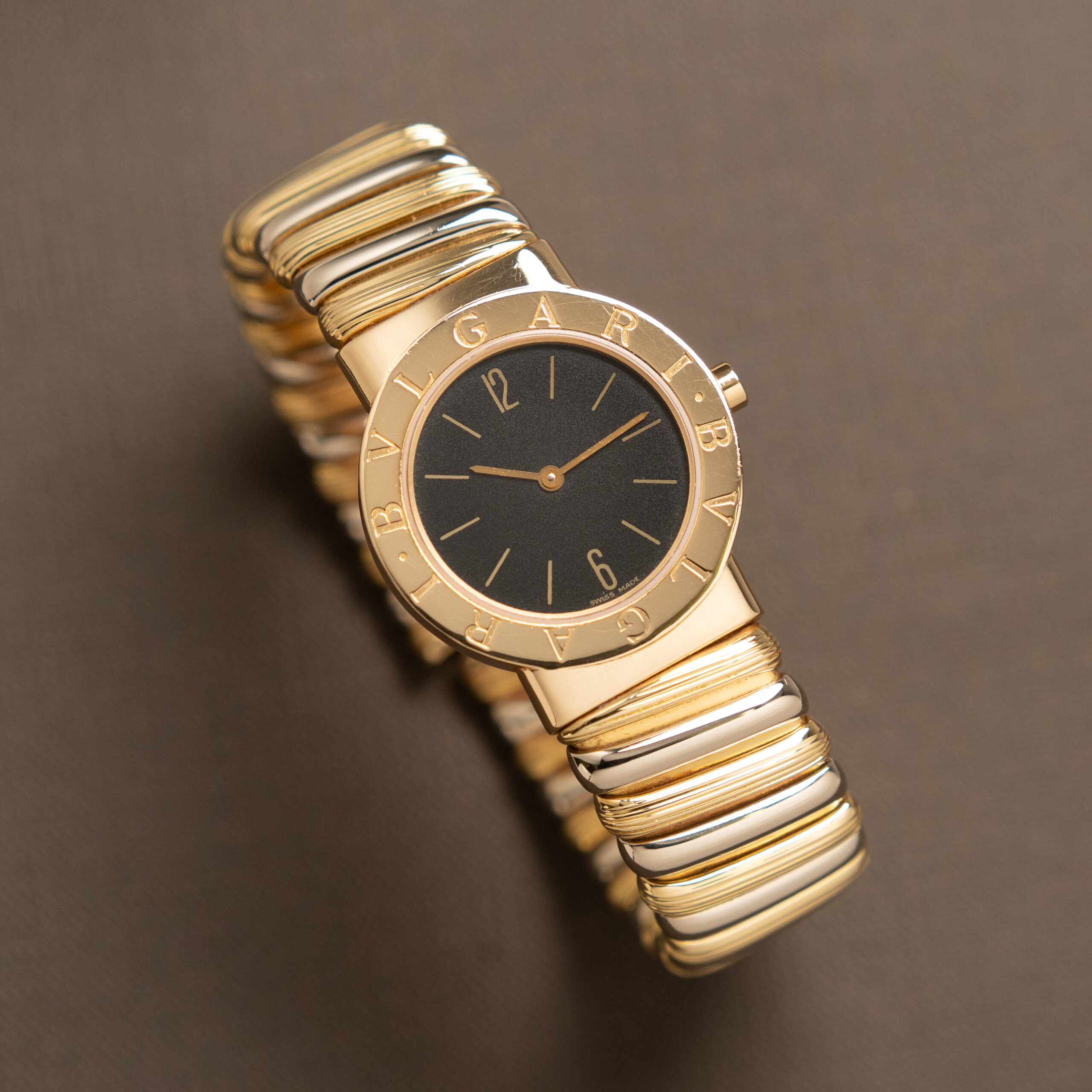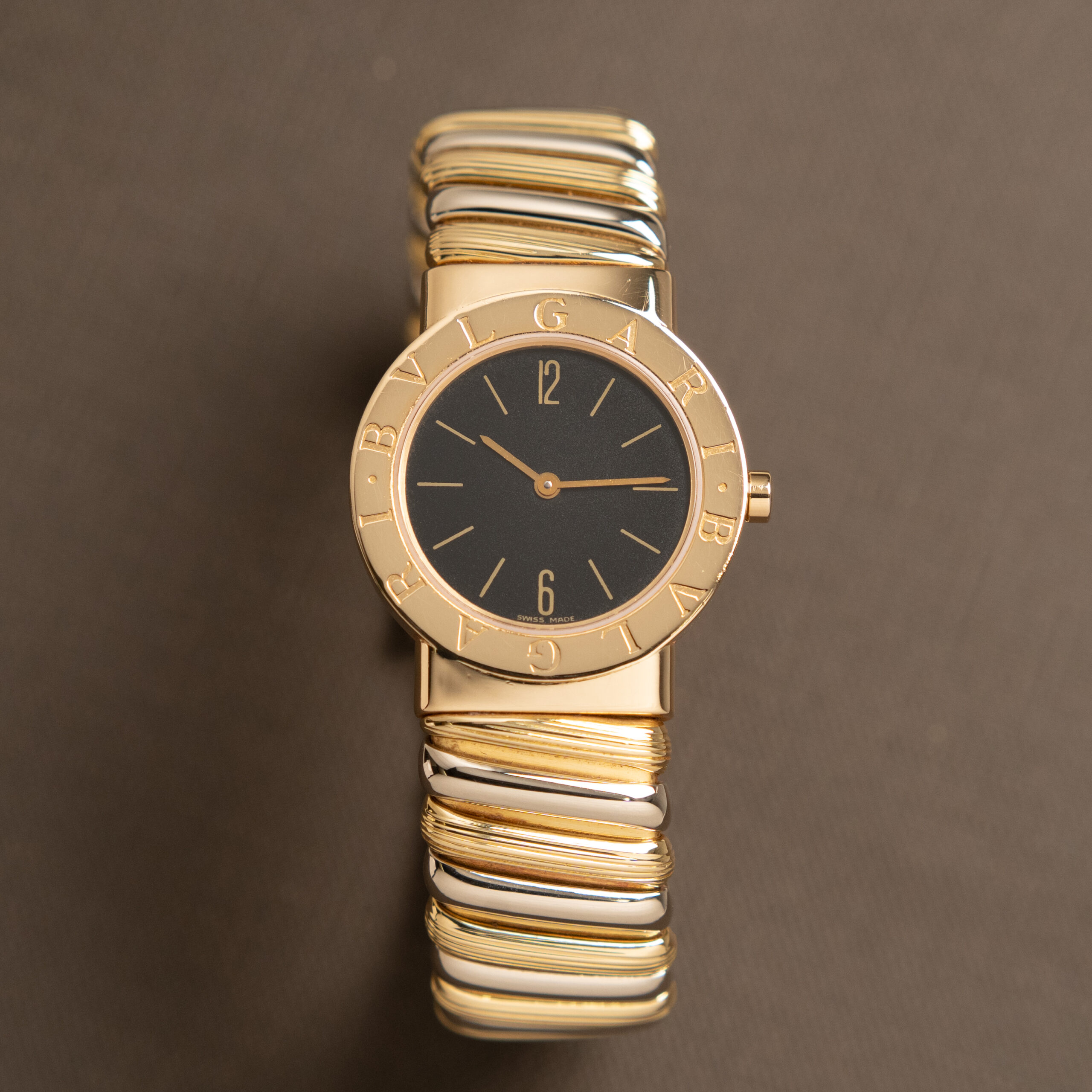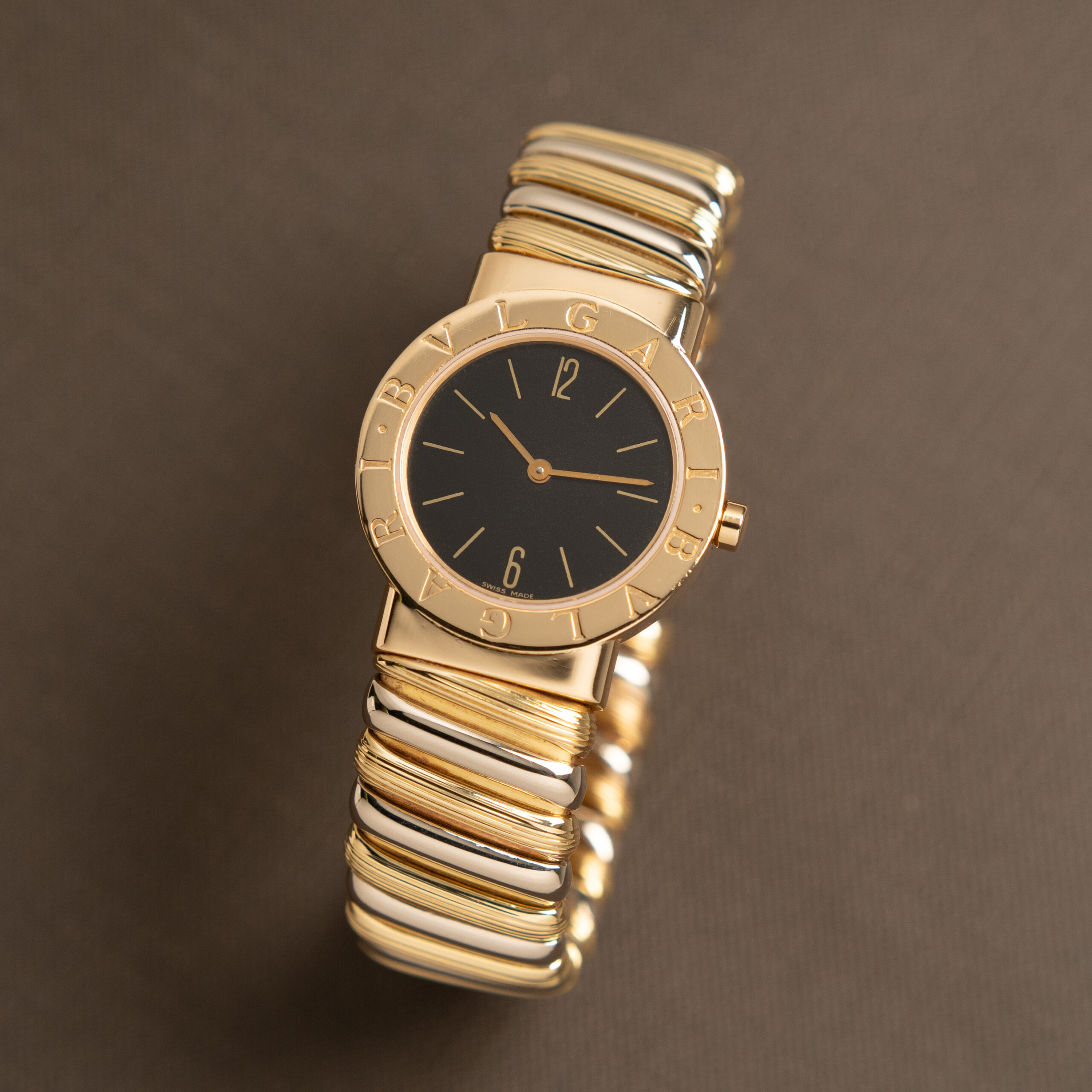 Bulgari Tubogas con cassa in oro da 26 mm, quadrante nero con indici in oro applicati e bracciale in oro bicolore. Dimensione bracciale M.