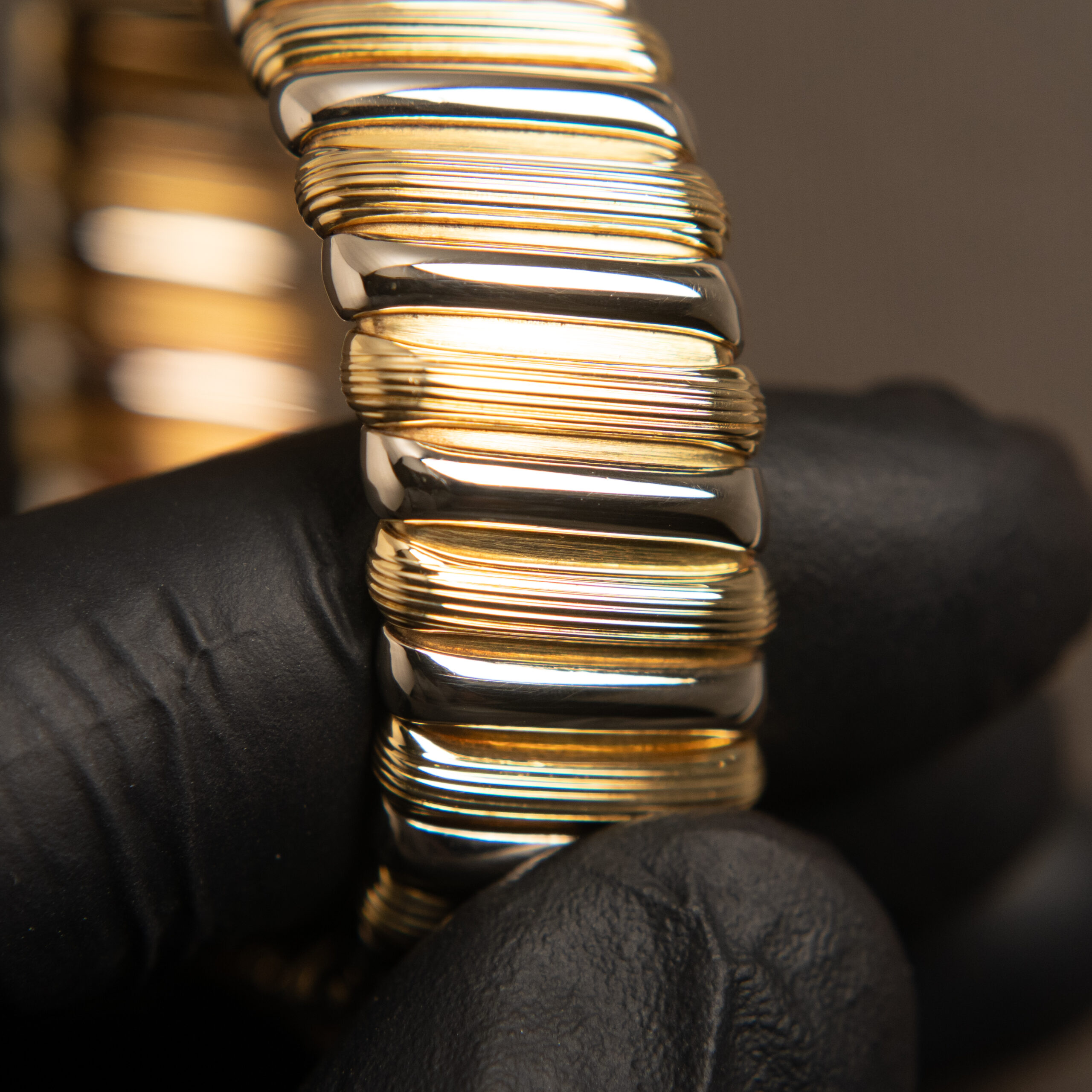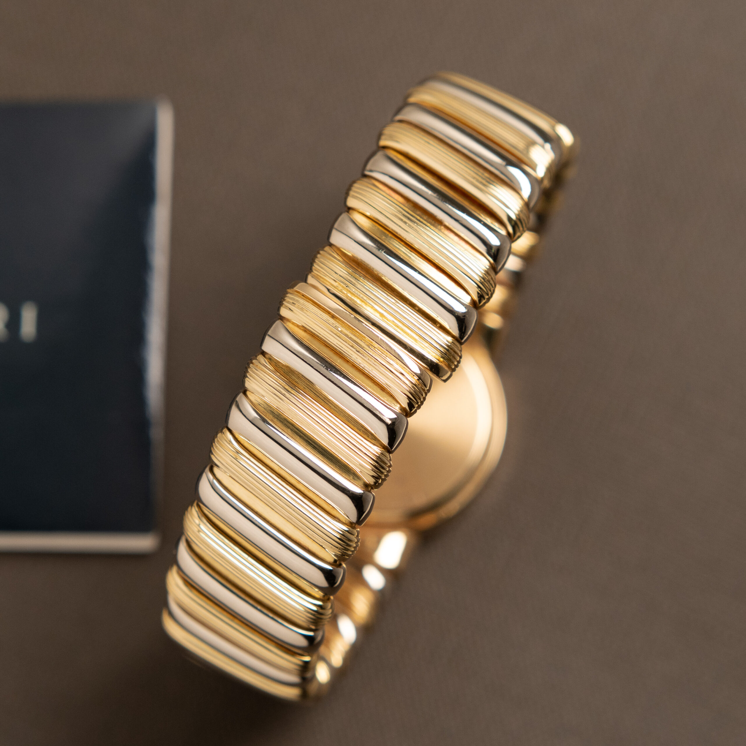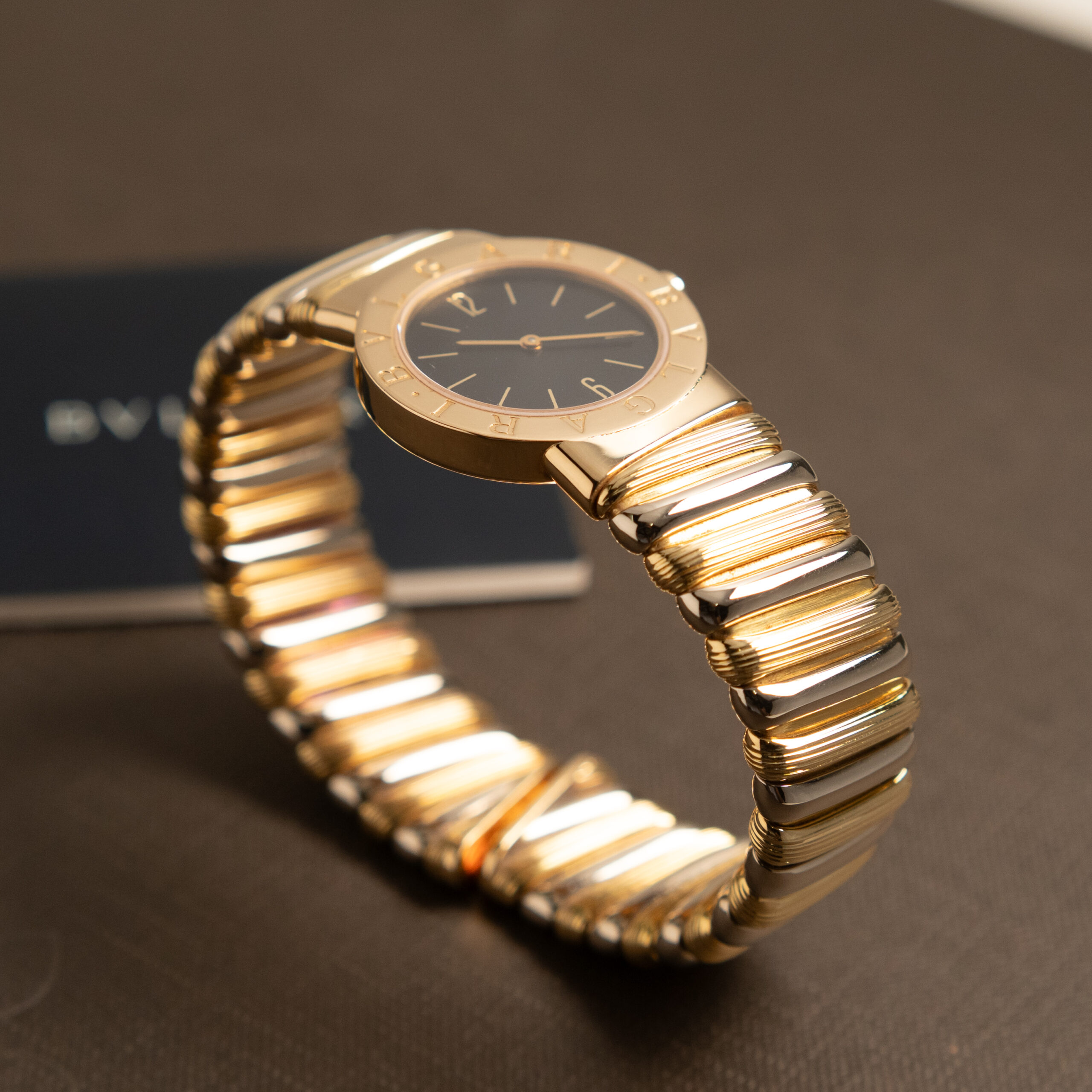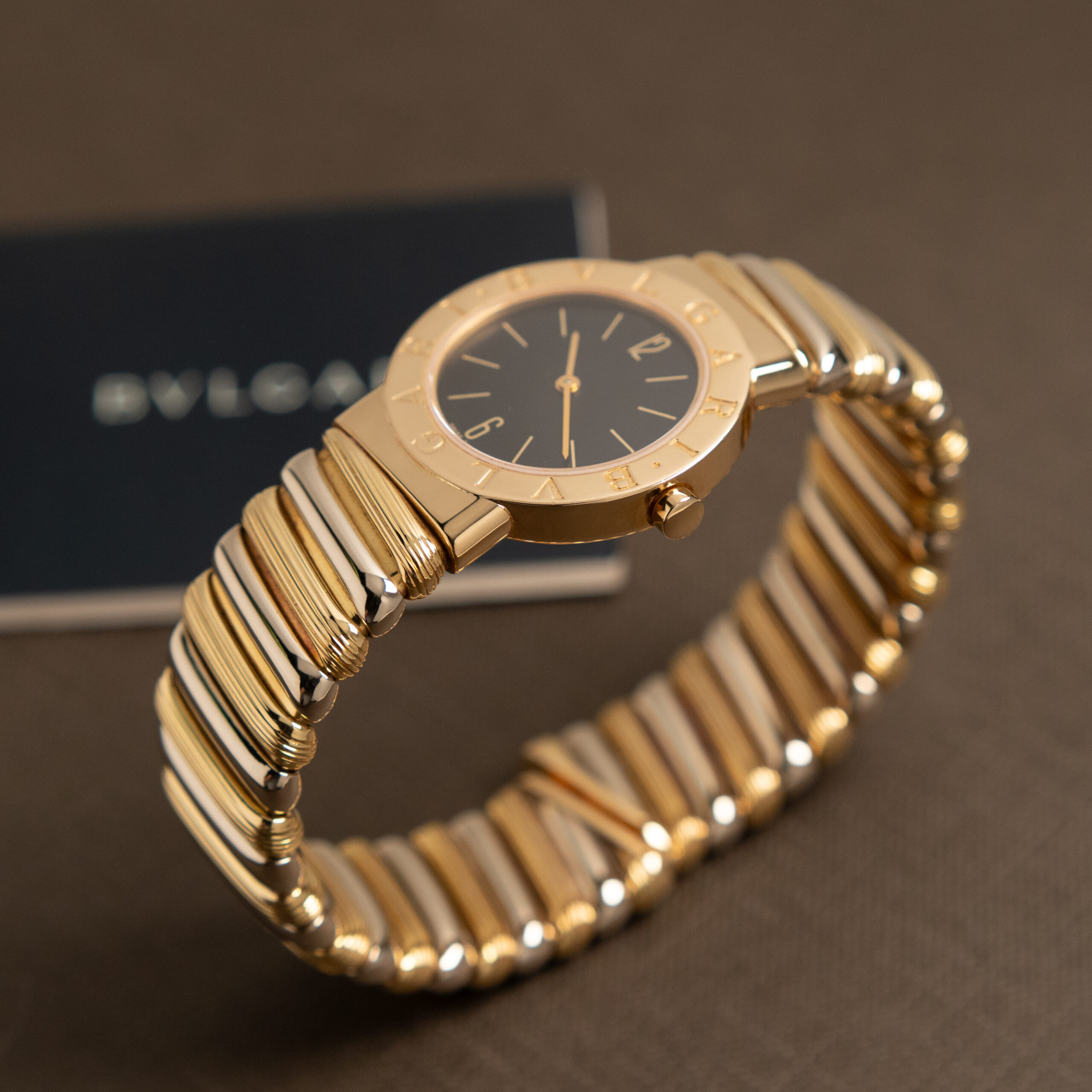 Bulgari Tubogas con cassa in oro da 26 mm, quadrante nero con indici in oro applicati e bracciale in oro bicolore. Dimensione bracciale M.